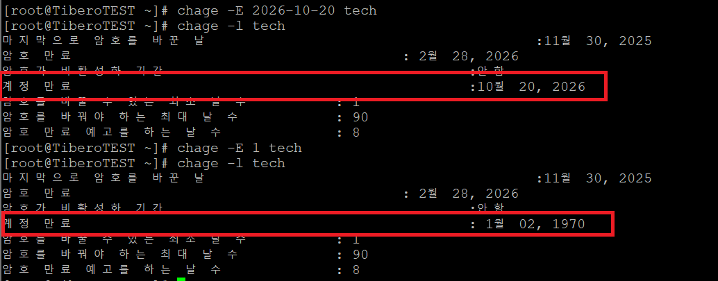 #설정하다 보면은 사용자 계정 만료일 설정(-E) 및 비밀번호 만료된 후 계정 영구적으로 잠기기(-I) 설정이 안 되는 경우가 있는데 이는 "마지막으로 암호를 바꾼 날"을 기준으로 생성되는 정보인데 없어서 보이지 않음